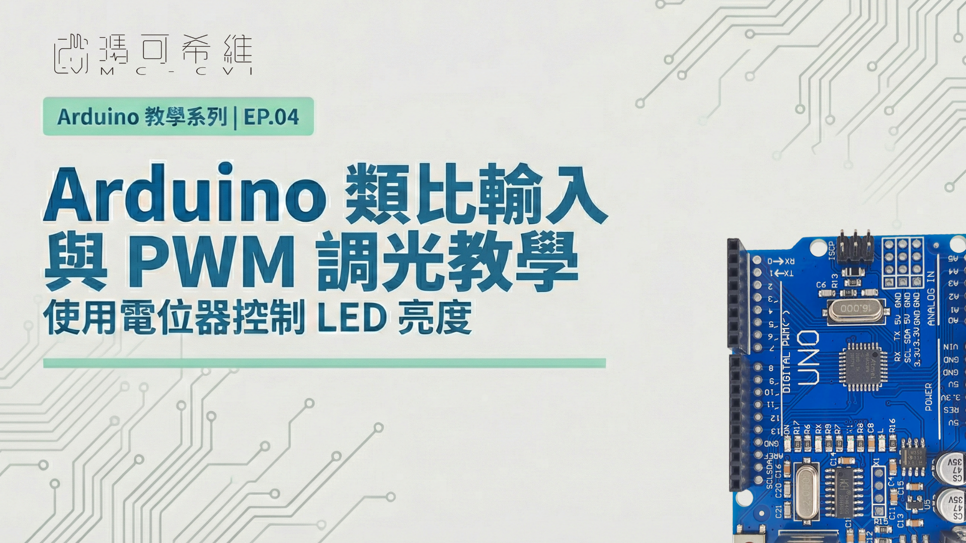 } 最終實驗觀察 上傳成功後,當你慢慢旋轉電位器,LED 將會呈現極為平滑的亮度變化。打開「序列埠監測器」,你會看到左邊的輸入數值(0~1023)與右邊轉換後的亮度等級(0~255)呈現完美的比例跳動。恭喜你已經掌握了 Arduino 類比控制中最核心的「類比輸入 > 換算 > 類比輸出」邏輯,這也是未來製作自動調光燈、溫控風扇等進階專案的基礎。 疑難排解:讀值跳動、LED 閃爍、接線未共地的常見錯誤 如果遇到「電位器調光」運作不如預期,別擔心,這通常是電路或程式中的小細節出了問題。下面這幾個狀況,是最常見的卡關點。你可以對照遇到的狀況來檢查排查錯誤。 狀況 1:旋鈕怎麼轉,數值都不變(固定在 0 或 1023) 腳位檢查:檢查電位器三腳有沒有接對,電位器中間的腳才是 Signal(訊號線),必須接在 A0。而兩側分別接 5V 和 GND。定義確認:檢查程式碼中的 analogRead(A0) 是否與實體接線一致,很多新手會把 A0 寫成 0 或 D0,讀到的就不是電位器。接觸不良:檢查電位器是不是插歪或接觸不良:麵包板沒插到底,會造成看起來「一直不動」。 狀況 2:讀值變動劇烈、不穩定(LED 亮度一直在抖動)最重要的「共地」:確認電位器的 GND 與 LED 的 GND 都有連回到 Arduino 的 GND 腳位。雜訊干擾:如果環境中電子設備過多,數值會輕微跳動。可以試將程式中 delay(20) 加大到 delay(50),讓數據輸出平滑一點,因為程式更新太快會看起來在抖動。麵包板軌道:部分大型麵包板中間的紅藍電源線是「斷開」的,請確認你的接線在同一區塊內,或有用跳線連接。 狀況 3:LED 只會亮或不亮,看不到漸亮漸暗PWM 腳位限制:LED 沒接在 PWM 腳位是最常見的錯誤!請確認 LED 的正極(長腳)接在有 「~」 符號的腳位(如 D3, D5, D6, D9, D10, D11)。注意:若你用的是不同板型或相容板:PWM 腳位標示可能不同,請以板子上的 ~ 為準。函式誤用:確認程式碼是用 analogWrite() 而不是 digitalWrite()、檢查 analogWrite() 的 pin 是否跟你接線一致:你接 D9,但程式寫 D6,就無法順利運行。 狀況 4:LED 完全不亮或亮度極微弱LED方向檢查:LED 是有極性的,長腳接到電阻那側(靠 PWM 腳位),短腳接回 GND。電阻值過大:如果用了過大的電阻(例如 10kΩ),電流會太小導致 LED 看不見亮光。建議使用 220Ω 到 1kΩ 之間的電阻。沒電阻可能燒 LED;電阻太大則會很暗。電壓不足:檢查 5V / 3.3V 供電是否一致,如果板子是 3.3V 系統,亮度與讀值會跟 5V 系統有差異,電壓不足但應該還是能正常變化,但LED 的亮度動態範圍會變窄。 到這邊我們已經完成了這個專案!雖然我們今天的目標是「電位器調光」,但這篇內容的真正的核心價值,在於你已經掌握了一套足以應付 80% Arduino 專案的通用控制流程:類比輸入(Input):從現實世界讀取一個代表「程度」的數字(如旋鈕位置、光線強弱、溫度高低)。數值轉換(Processing):利用 map() 函數,將讀到的數字精準翻譯成你需要的控制刻度。類比輸出(Output):利用 PWM 技術 與 analogWrite(),將結果轉化為實體的動作(如亮度、轉速或聲音)。只要掌握了這套「讀取、轉換、輸出」的邏輯,你就能隨意更換手邊的零件,變換出無數種組合。例如:將電位器換成光敏電阻,調光燈就變成了「自動感應小夜燈」! Arduino PWM 進階觀念與延伸應用 掌握了這套通用的控制流程後,我們可以進一步思考:除了控制 LED 亮度,PWM 還能應用在哪些地方?在 Arduino 的世界裡,只要涉及控制強弱、速度或頻率,幾乎都是 PWM 的守備範圍。不過,不同硬體裝置對訊號的「運作特性」與「訊號規範」其實都不太一樣,這也決定了我們在程式中會選用最合適的指令,例如: LED 看重「脈寬比例」:只需要知道一段時間內「開」與「關」的佔比(Duty Cycle),佔比越高燈就越亮。馬達看重「時序精確度」:需要極其精確的脈衝寬度(脈衝持續時間的長短)來決定轉動的精準位置。聲音看重「震盪頻率」:需要透過改變開關切換的「速度」(Frequency)來產生高低不同的音高。 為了讓開發流程更方便,Arduino 已經預先將這些複雜的物理計算封裝成了更直觀的專用函數。這就是為什麼在控制馬達或聲音時,我們會針對其控制邏輯切換指令,而不再僅僅使用 analogWrite()。 1. 直流馬達(DC Motor):控制轉速快慢 直流馬達與 LED 的原理相同,是利用 PWM 改變輸出的平均電壓來決定旋轉快慢。指令特色:使用 analogWrite(0-255)。 因為 LED 是控制「亮度的強弱」,而馬達則是控制「轉速的快慢」,兩者邏輯完全一致。應用場景:遙控車加減速、小風扇的風量調節。映射邏輯:因為旋鈕讀值是 0~1023,而馬達速度範圍是 0~255。所以映射公式為:map(val, 0, 1023, 0, 255)。 2. 伺服馬達(Servo Motor)的角度控制 伺服馬達屬於位置控制。它會解讀脈衝的持續時間,並轉向特定角度後停住。指令特色:analogWrite 給的是比例(0-255),但伺服馬達需要的是角度。為了方便操作,Arduino 準備了 write(角度) 指令,讓你直接指定 0 到 180 度。應用場景:機器手臂的關節、自動門的開關(轉 90 度開門,轉 0 度關門)、攝影機的旋轉底座。映射邏輯:因為旋鈕讀值是 0~1023,而馬達的旋轉範圍是 0~180 度。所以映射公式為:map(val, 0, 1023, 0, 180)。 3. 無源蜂鳴器(Passive Buzzer)的音高控制 蜂鳴器發聲是靠快速開關產生的震動。震動得越快,聲音就越高。指令特色:analogWrite 的震動速度(頻率)是固定的,聽起來音高不會改變。為了能彈奏音階,Arduino 準備了 tone(頻率) 指令,讓你直接指定每秒要震動幾次(Hz)