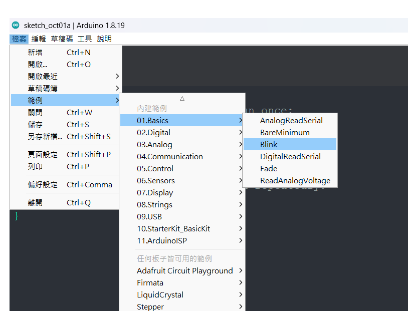 在 Arduino IDE 依序點:檔案 ➜ 範例 ➜ 01.Basics ➜ Blink
