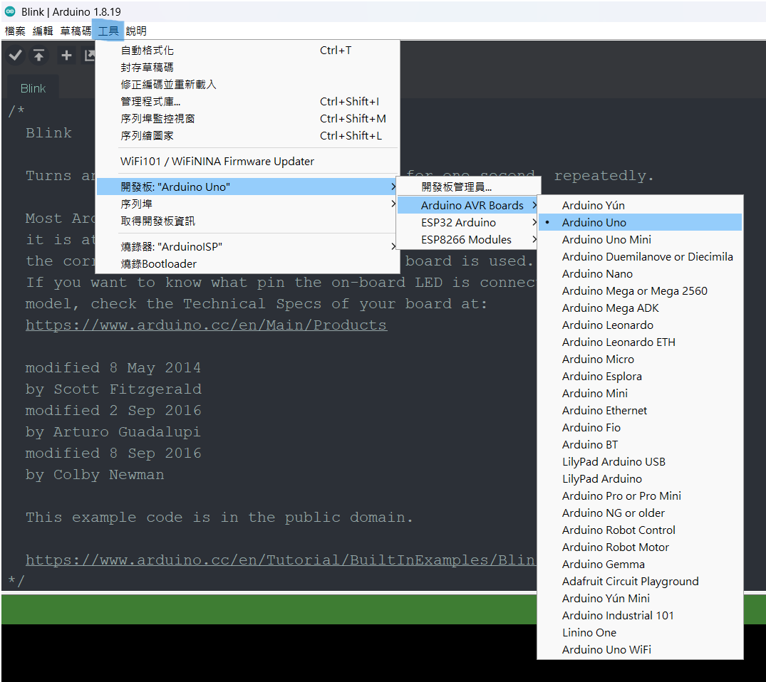 我們使用 IDE 內建的 Blink(這是一小段已寫好的「LED 閃爍」程式)來測試這個流程。
